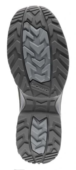 Diese Sohle hat scharfkantige, mitteltiefe und selbst reinigende Gummiprofile, die eine gute Griffigkeit auf unterschiedlichem Untergrund und bei